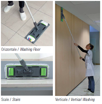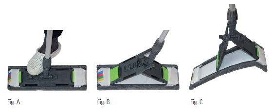 Consente all’operatore di non toccare mai il MOP sporco dopo l’utilizzo, garantendogli quindi la massima igiene e sicurezza durante il lavoro (doppio sistema di apertura/ chiusura ad inerzia e/o a pulsante; vedi Fig. A, B, C).